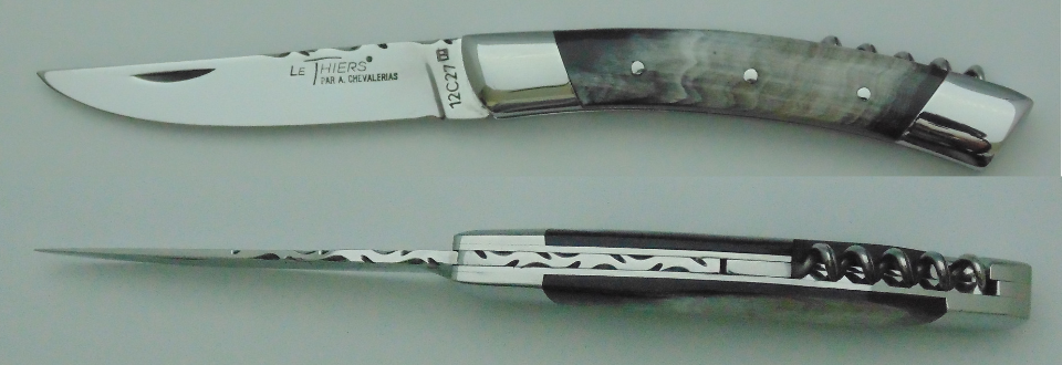Suite a la réflection commune de toute la proféssion coutelière thiernoise, le couteau "Le Thiers" est né. Encadré car la confrérie nous avons créé notre propre game de Thiers. "Le Thiers par Alain Chevalerias". On le reconnait par sa ligne double vague.