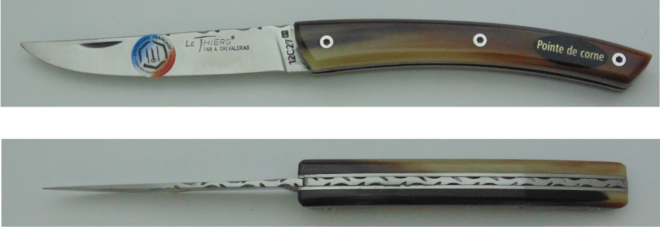 Suite a la réflection commune de toute la proféssion coutelière thiernoise, le couteau "Le Thiers" est né. Encadré car la confrérie nous avons créé notre propre game de Thiers. "Le Thiers par Alain Chevalerias". On le reconnait par sa ligne double vague.