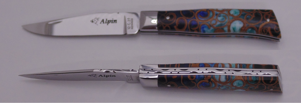 Les manches : Ebène, genévrier, olivier, pistachier,…résines, plexis couleur,… Corne pressée, pointe de cornes, os, croute de buffle, bélier, cerf…